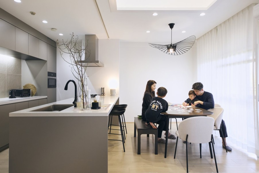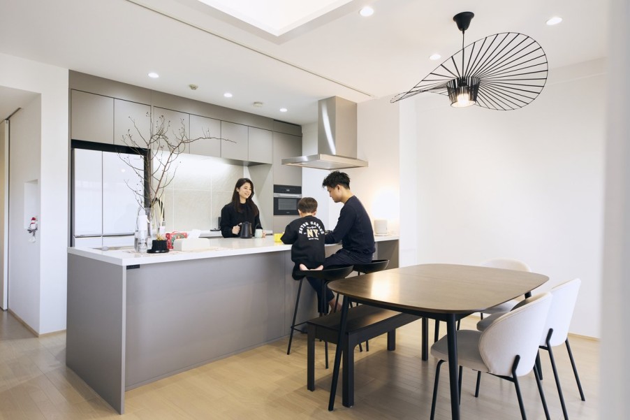 「前の家は食洗機がなかったので、手洗いする時間が節約できて家事が楽になりました。夢だったバーベキューグリルも設置してもらって、最近は自分たちで串にお肉を刺して焼き鳥を作って楽しんでいます。作業がしやすくなり、開放感もあって最高ですね。キッチンからはリビングダイニングで何をしているかがよく見えるので、家族や友人と会話しながら料理するのが楽しいです。将来的には、キッチンスタジオとして貸し出しができたらいいなと思っています。ひとつだけ、これからリノベーションする方へのアドバイスとして、カップボードの収納は観音開き扉よりも、引き出しの方が使いやすくておすすめです。」(H様)