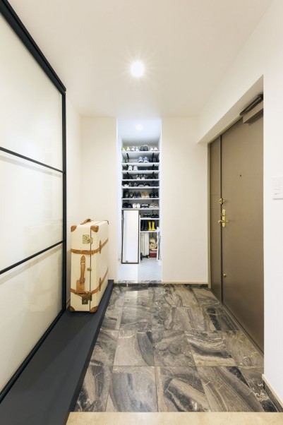 玄関は、床の大理石を既存利用。もともと設置されていたシューズボックスを取り払い、踏込床を造作しました。現在はキャリーケースを置いていますが、将来的には植物とベンチを置きたいと考えているそう。玄関を入って左には、奥様がこだわったアーチの開口があり、奥へ進むと隠れ家のようなヌックがあります。ちょっとした腰掛けとしても、お子さんたちの遊び場としても、ご両親がお泊まりする際の寝室としても使うことができ、床下収納とコンセントも備え付けた便利なスペースです。 - 3理想のインテリアに出会う楽しみ