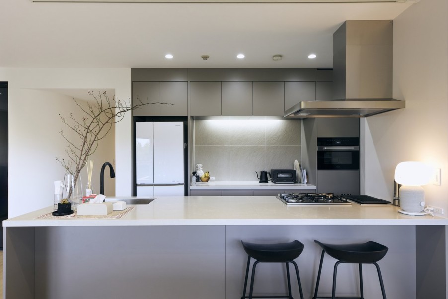 大きなキッチンは、リビングダイニングにいる家族や友人と空間を共有できるオープン設計。最初はアイランド型を考えていたそうですが、マンションの管理規約でパイプスペースやガス管の位置を変更できなかったためペニンシュラ型に。キッチンの前面にはダイニングテーブルとしても使うことができるカウンターを造作しました。テーブルに料理を運ぶ手間が省けて家事動線の短縮になるため、お子さんと食事する際はカウンターが大活躍しているそう。海外メーカー「ミーレ」の巨大食洗機とビルトインオーブン、「ガゲナウ」のバーベキューグリル、4口コンロ、浄水器付き水栓、傷や汚れに強いシーザーストーンの天板を採用するなど、デザインだけでなく機能面にもこだわりが詰まっています。