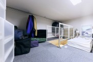 ガラス引き戸でリビングとつながる約5.4帖のサービスルーム(納戸)は、在宅でお仕事をされる奥様のワークスペースです。椅子を並べてお子さんと一緒に勉強ができる広さのデスクに設計しました。奥は可動棚を設置したシューズインクローゼットになっており、白い引き戸を開けると玄関と繋がります。