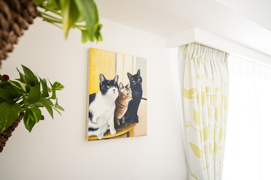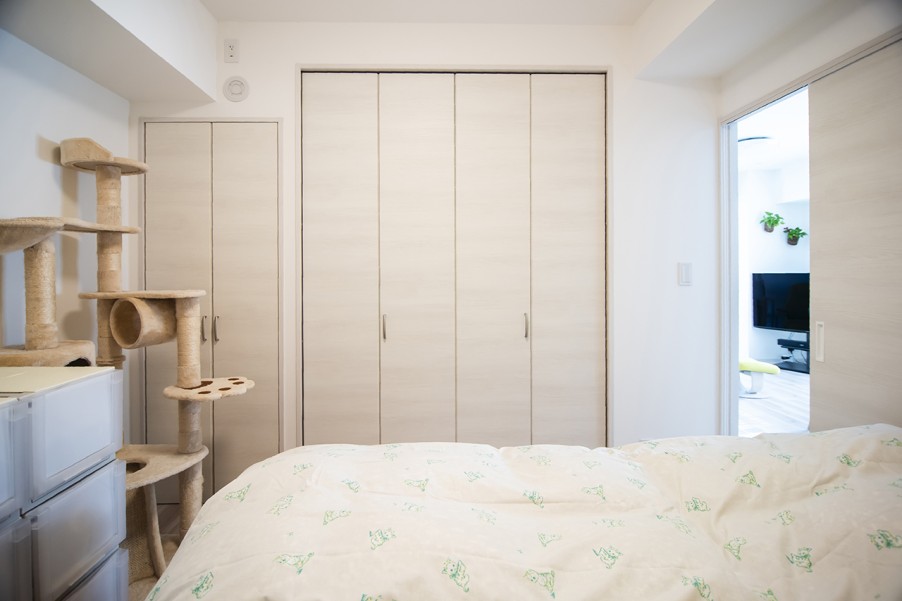 前のお住まいから使っているキャットタワーや爪とぎ、猫用ソファを置いてもゆとりのある広さで、リビングの窓からは電車が走っている様子を見ることができます。南東向きのリビングは一日中陽が差し、外を見ながら日向ぼっこするのが好きな猫ちゃんたちにとっても、快適に過ごせる環境です。 - 2収納スペースを倍増し、色や配置の工夫を盛り込んだ空間に