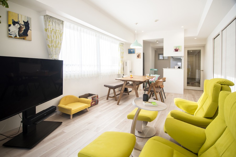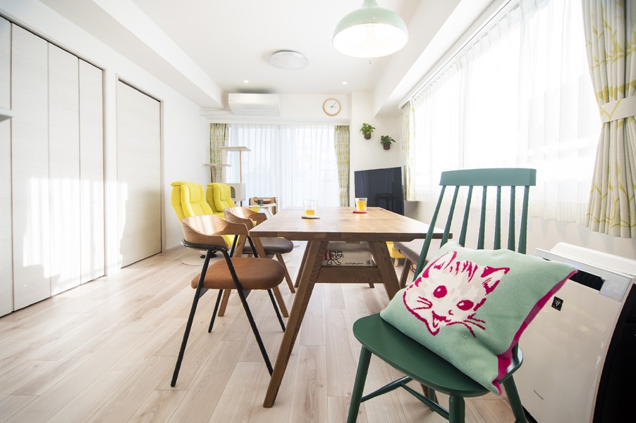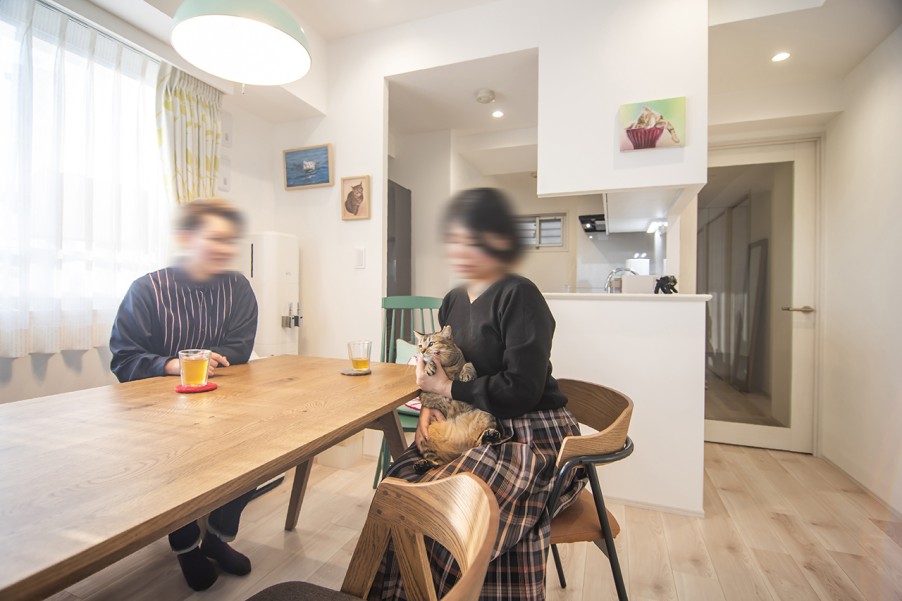 「初めはオーダーリノベーションではなく、リノベーション済物件を検討していました。隣のマンションは綺麗にリノベーションされていて気に入ったのですが、猫と一緒に住むには少し狭かったんです。そこから営業担当の方に物件を紹介いただいたきながら1ヶ月ほどで4件内見しました。この物件は、他の物件を内見する日の朝にタイミング良く見つけて、陽当たりや眺望、マンションの管理状態なども良かったので、その場で申し込みました。外観は綺麗ですが、内装は新築時から手が加えられていなかったため古く感じ、水まわりは特に一新したいと思ったのでオーダーリノベーションすることにしました。『マイリノ』なら設計や施工まで一括してお任せでき、不動産仲介手数料が半額になると聞いて、数多くの物件を手掛けているのも見てそのままお願いしました。これまで不動産をこまめに見ていたわけではなかったので、ポストにチラシが入っていなければグローバルベイスとは出会わなかったかもしれないですね。」(H様)
