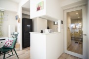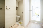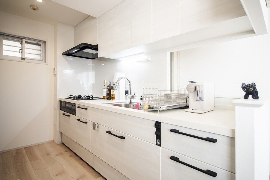 リノベーションでは、在宅でお仕事をされるS様のワークスペースを確保し、各洋室とリビングに収納豊富なクローゼットを新設。壁に囲まれて独立していたキッチンは、リビングダイニングと開口を通じてつなげたことで明るく開放的な空間に。水まわり設備の位置は大きく変更していませんが、洗面室とトイレの扉の位置を変更したことで廊下が広くなりました。リビングドアは猫ちゃんたちをいつでも見守っていられるようにガラスを採用し、床や建具の色は白で統一して、空間がより広く見えるように工夫しました。