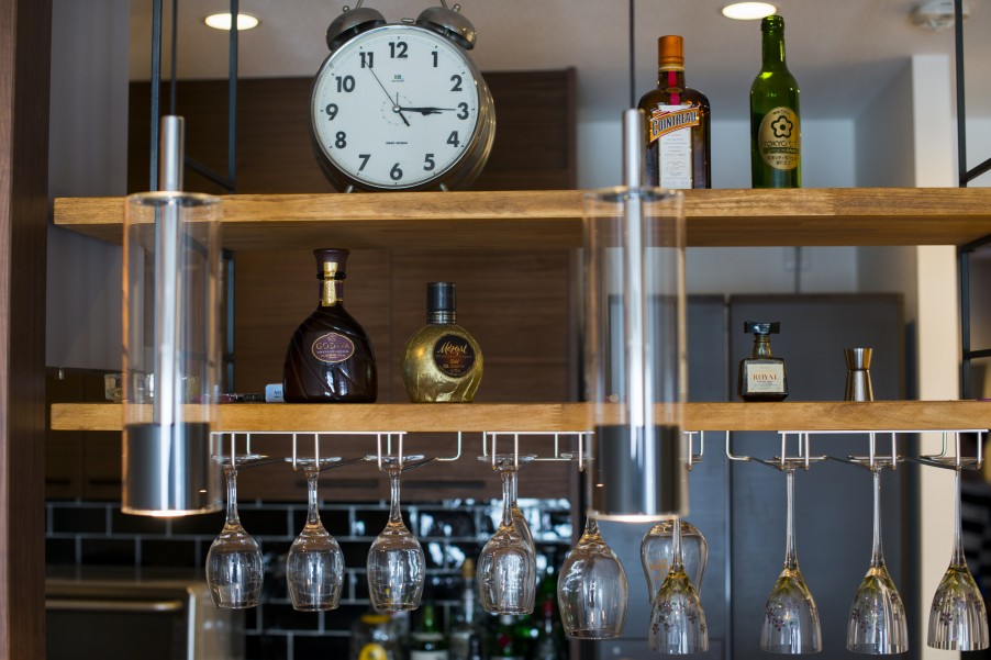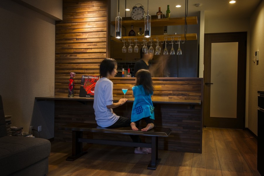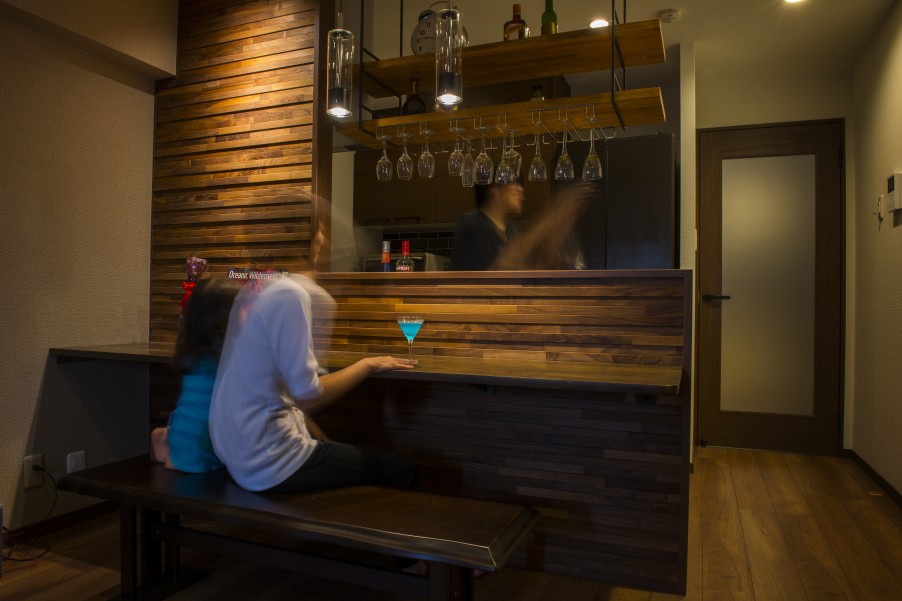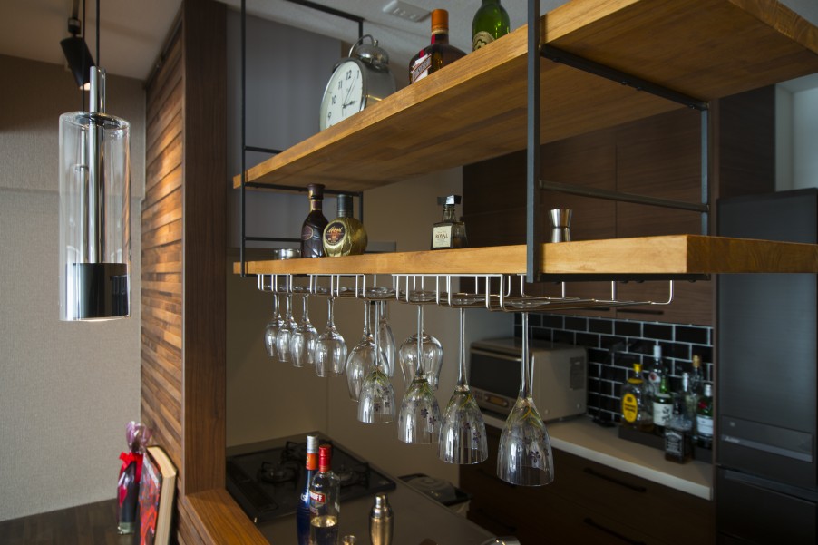 また、部屋全体に光が行き渡らせるために、部屋と部屋を仕切る引き戸やドアには磨りガラス調のパネルを組み込みました。 - 3旦那様よりコメント念願のホームバーを持つことができ、毎晩のように自宅でお酒を楽しんでいます。週末には夫がカクテルをつくり、妻に振る舞うことも。家に帰ってくるのが以前にも増して楽しくなりました。デザインも雰囲気も、思っていた以上の仕上がりになり、とても満足しています。