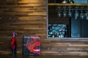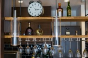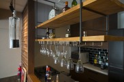 リキュールなどをディスプレイ収納できるよう、カウンター上にはオープン棚を造作。グラスハンガーも設置し、