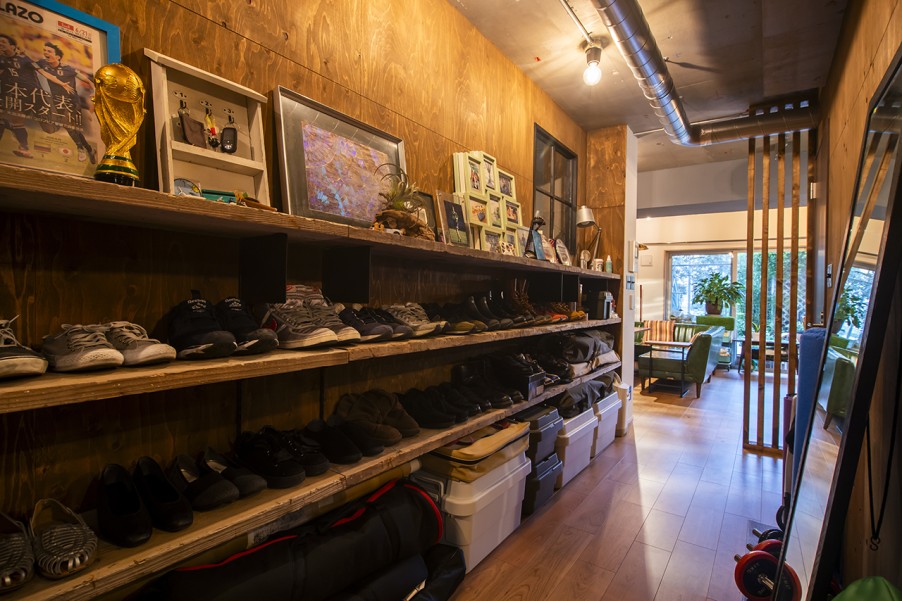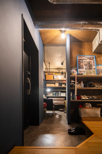 玄関を入って左には、ガレージのような隠れ家スペースにしたかったという土間(約3.6帖)があります。土間にソファを置いたことで、遊びに来た奥様のご友人が靴を履いたまま座って気軽に長話できる場所、カウンターに置いた漫画を読みながらくつろげる場所として使えるスペースとなりました。土間からは、家族5人の寝室につながります。
