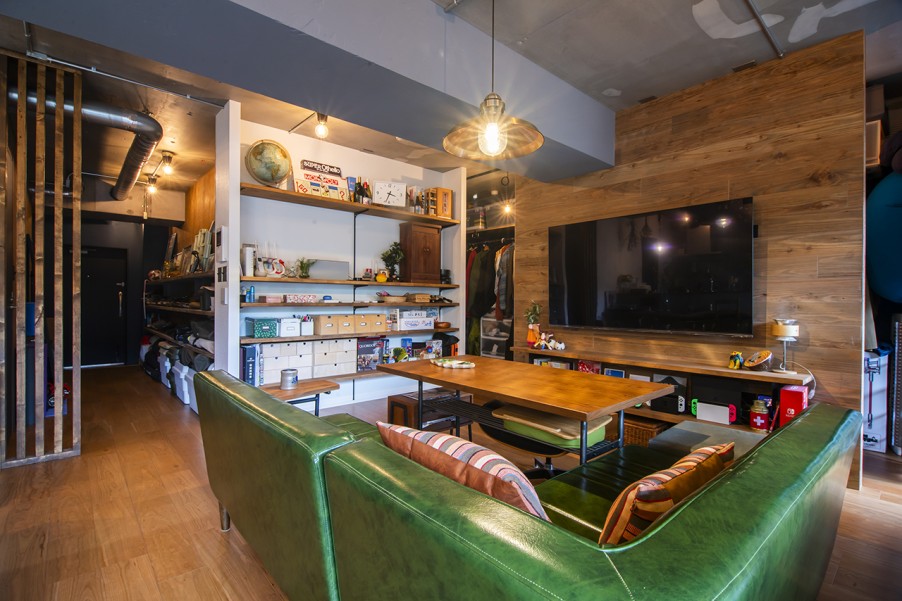 リビングでひときわ目を引くのは、インテリアショップで座った瞬間に一目惚れしたというダークグリーンのソファ。リノベーションする前に買っておいたそうで、柔らかすぎず硬すぎない座り心地で、革のツヤ感が空間のかっこよさをより一層引き立てます。