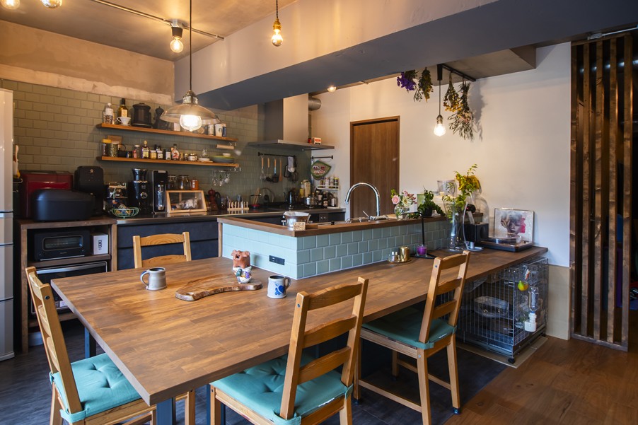 キッチンに沿って一枚板で造作したL字のカウンターテーブルの脚には、以前使用していたテーブルのアイアンを再利用しました。カウンターテーブルの表面は、思い出作りにと家族みんなで塗装を施したそう。高さは、下部にペットのうさぎ・ショコラちゃんのケージがぴったり収まるように設計しています。