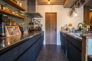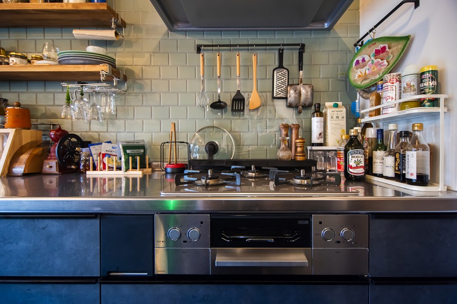 洗面室からはキッチン(約8.3帖)につながります。大人が楽にすれ違える通路幅を確保した二列型キッチンで、海外メーカー「ミーレ」の食洗機を実装し、作業がしやすいように天板を高めに設計しました。「食器洗いの時間がないだけでだいぶ楽ですね。グリルも便利でよく使っています」とS様。キッチンの壁面には、数あるサンプルの中から見つけたという、マットな質感で落ち着いた色合いが特徴の淡いグリーンの施釉(せゆう)タイルを採用。ウォールシェルフにはコーヒーミルや調味料などが並びます。
