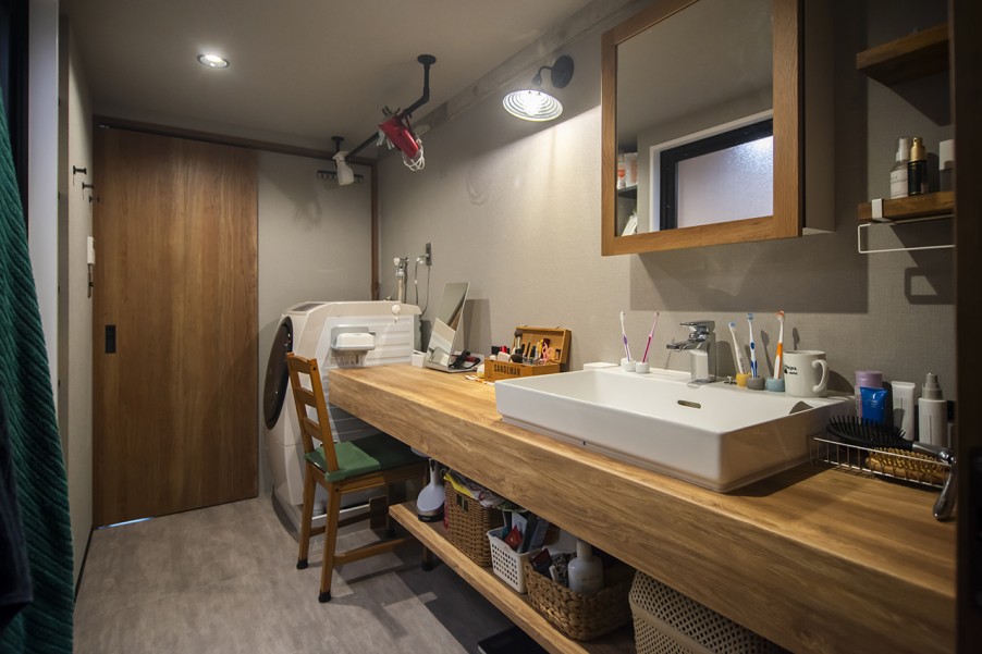 玄関を入って右には、仕事部屋として使用できるスタジオ(約5.7帖)があります。仕事道具をまとめて置くことができ、スタジオからは洗面室につながります。洗面室は、家族で並んで朝の支度ができる幅広い洗面台とスペースを確保しました。最近は、お子さんたちが座って美容男子として時間をかけているそう。