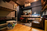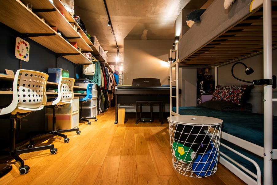 「リノベーション前は4LDKの間取りでしたが、平米数のわりに狭く感じていました。そのときから、それぞれの部屋で過ごすよりも、みんなでリビングに集まって過ごすことが多かったので、リノベーションでは寝室と収納をコンパクトにしてリビングを広く取りたいと思っていました。今は、ひとつの寝室に5人分のベッドを置いています。薄暗い雰囲気が好きだったので、玄関を入ったあたりは薄暗く、奥に行くと庭の緑に包まれた明るい癒しの空間にしているのがポイントです。」(S様)