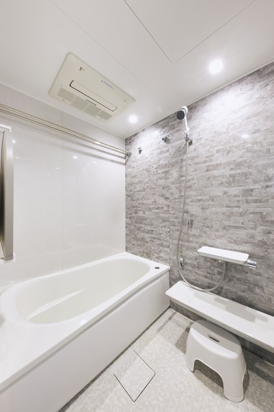浴室には床洗浄機能を取り入れ、掃除のしやすさにこだわっています。洗面台はお気に入りのホテルを参考に、白い天板と洗面ボウル、グレーのタイルでデザインしました。トイレにはペーパー収納に便利な吊戸棚と造作カウンターを設置しています。 - 3インテリアや趣味の時間が楽しみに