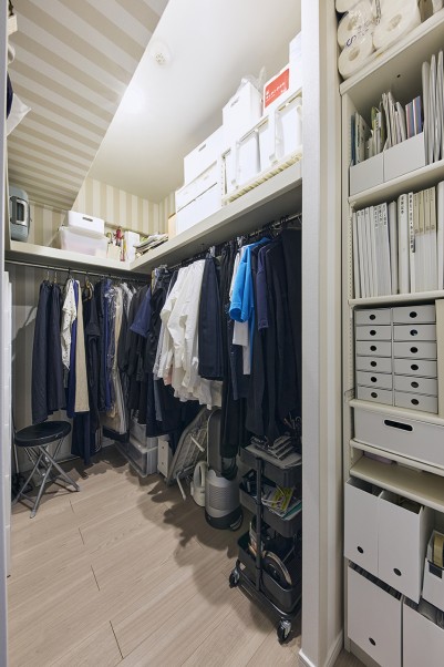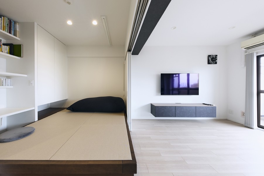 間取りは、リビングと洗面室を回遊できる既存のレイアウトを活かし、ウォークインクローゼットを新設して収納スペースをたっぷり確保しました。玄関にあるミラーの裏や造作ベンチの下、リビングと隣接する小上がりの畳の下も収納スペースとして活用しています。小上がりの和室は、配置や広さ、高さ、カウンターの設計など、何度も打ち合わせを重ねました。