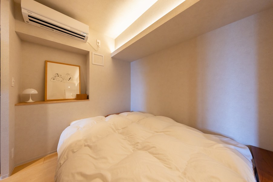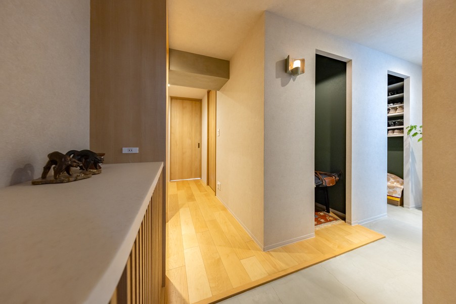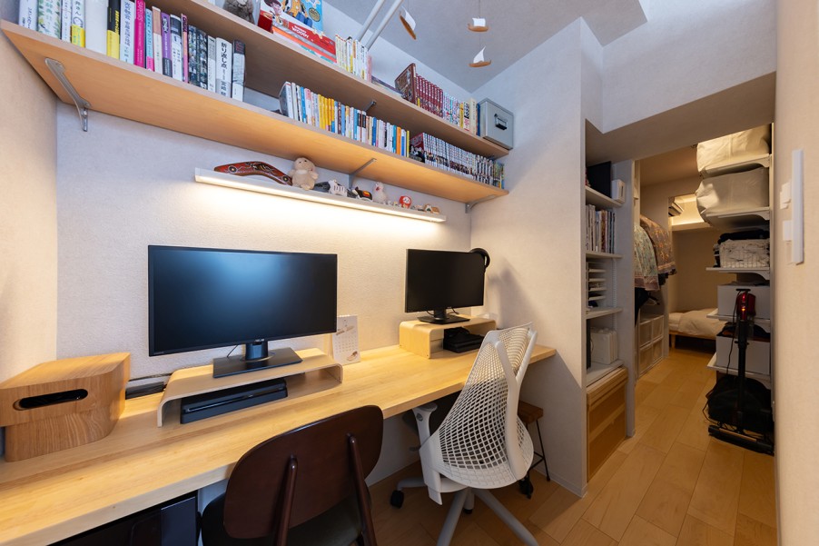 リノベーション前は部屋数を重視した3LDKの間取りだったため、リビングや玄関が狭く感じられました。広いリビングと土間を希望されたため、寝室とワークスペースをコンパクトにまとめ、収納スペースもたっぷり確保しています。
