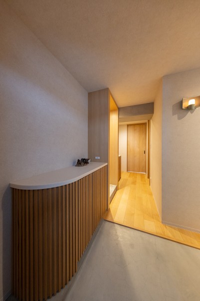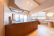 キッチンスペースは、三角形に出っ張っていた間取りを活かし、カーテンで隠せるパントリーを新設。冷蔵庫や家電などをすっきり収納できるように設計しました。リブパネルが印象的なキッチンは、洗面台や玄関収納とデザインを揃えて造作。壁面には、ゆらぎのある焼き物らしい質感が印象的なタイルを施工しました。