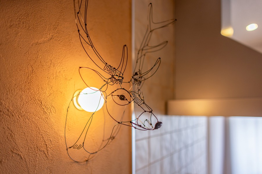 リビングは、ぬくもりを感じる珪藻土の塗り壁がこだわりポイント。手塗りならではの味わいが、やすらぎの空間を演出しています。壁には厳選したブラケットライトを取り付けました。