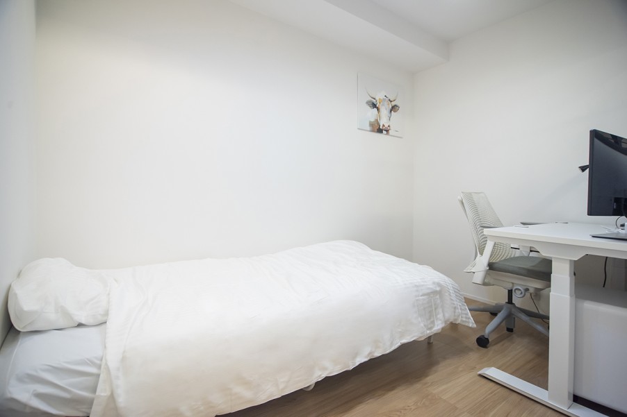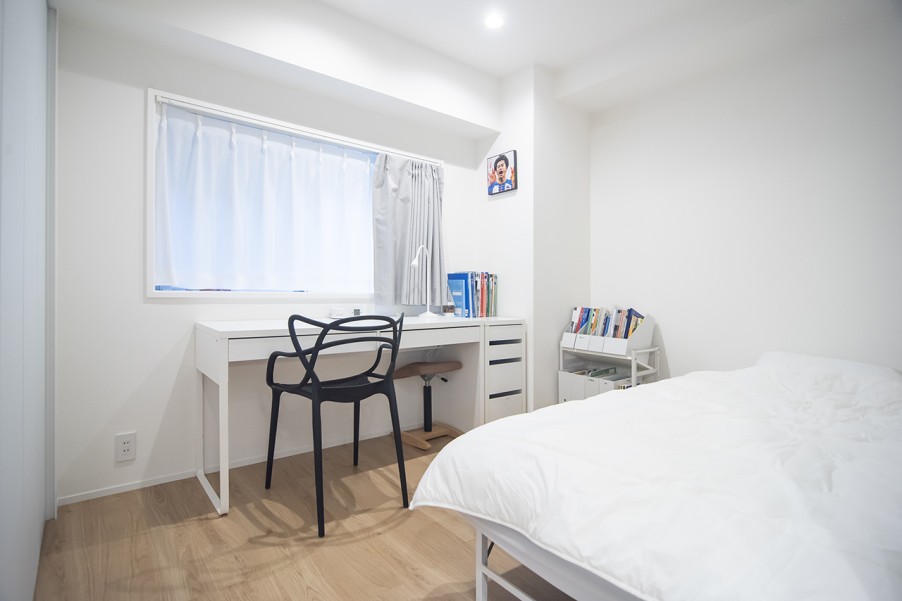 リノベーションでは、お子さんが成長したときにそれぞれの部屋を使えるように4LDKの間取りに設計しました。各部屋の使い方はまだ定まっていませんが、デスクのある部屋はご主人の在宅勤務や、お子さんのオンライン学習に活用されています。将来的にお子さんたちがそれぞれの部屋を使うようになっても、リビングを通って行き来できる動線にしたことで、閉じこもりすぎず、自然とリビングで顔を合わせられる設計にしました。また、ドアには光が漏れるデザインを取り入れたことで、どの部屋にいても家族の気配を感じられます。