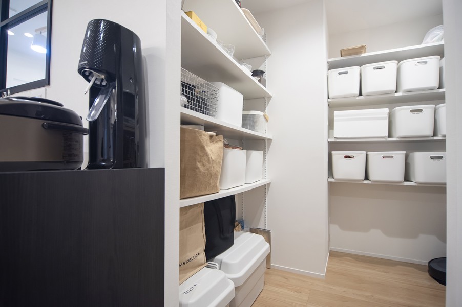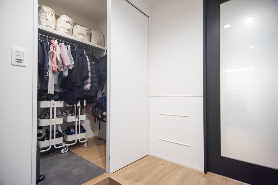 収納も使いやすさを重視して広さや配置にこだわりました。サッカーをするお子さんたちのため、玄関には広めのシューズインクローゼットを、洗面室を出てすぐの壁面にはハンガーで衣類をかけられる収納スペースを確保。さらに、リビングにはお子さんたちの学校関係の物を整理できるスペースを設け、キッチンにはパントリーも設置しました。