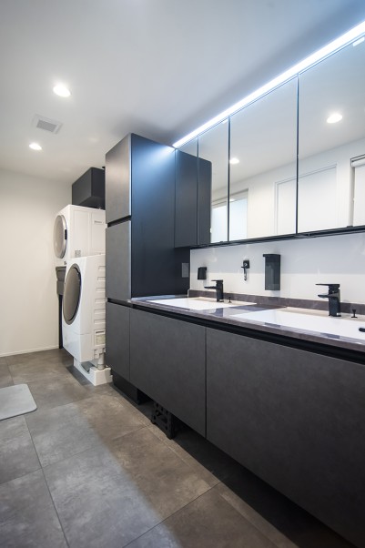 洗面台は、朝の混雑を避けるため2ボウルを採用しました。スポーツをするお子さんたちの洗濯物が多く、生乾きに困っていたため、ガス乾燥機「乾太くん」を導入しました。以前の電気乾燥機では時間がかかっていた問題も解決し、「洗濯物が溜まらなくなり本当に助かっています」と奥様。 - 3リノベーションで叶えた理想の住まい