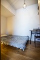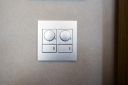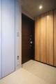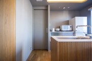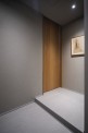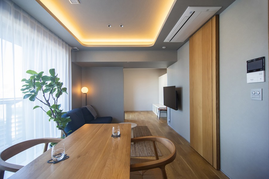間取りは、1LDKから2LDKへ変更。玄関にはベビーカーやゴルフバッグを置ける収納スペースを、洋室1には間仕切り壁を設けて衣類の収納スペースを確保しました。洋室1はプロジェクターを使用するため白い壁紙を選び、その他の部分はグレーと木を基調に仕上げ、スイッチや巾木の色にも統一感を持たせています。各部屋の扉にすべて引き戸を採用したことで、開けたままでもスッキリとした空間を保つことができます。