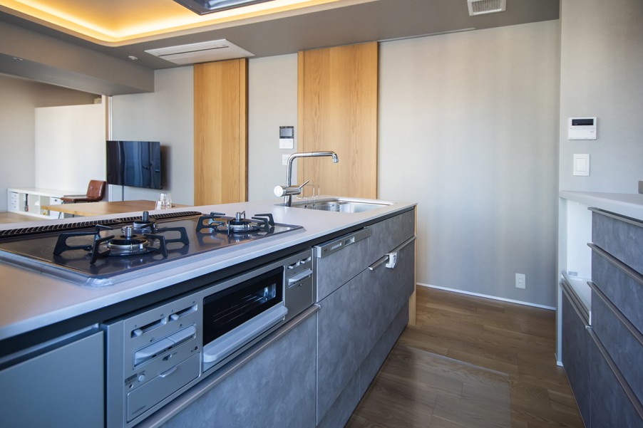 無垢材の建具やキッチンの格子、突板のフローリングも相まって、より落ち着いた空間に仕上がったと思います。