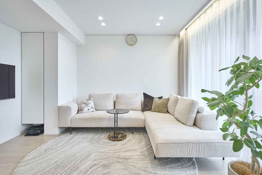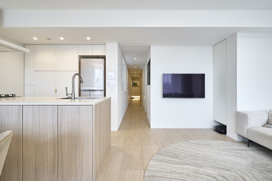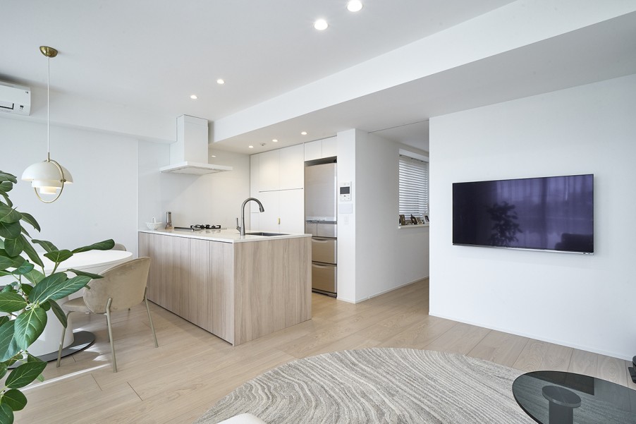 「物件購入後に希望通りのリノベーションができなかったら嫌だなと思って問い合わせたところ、担当の設計士が一緒に内見に同行してくれました。具体的なテイストはまだ決まっていませんでしたが、『何ができて、何ができないのか』を見てくださって、『この壁は壊せますか?』『キッチンはこういう形にできますか?』といった希望についても確認してくれました。『お願いするかどうかはご自由に』というスタンスも相談しやすく、他社とも比較した結果、安心感やスピード感が決め手となり、マイリノにお願いすることにしました。」(Kさま) - 2シンプルで落ち着いた空間に