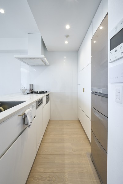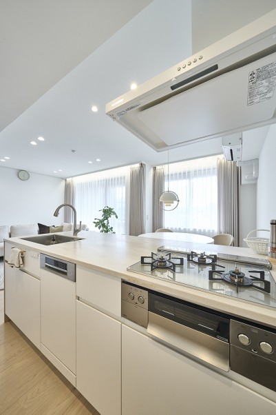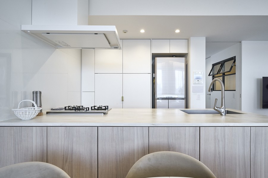 「北欧家具のBoConceptが好きで、リビングダイニングはすべてBoConceptで揃えたいと思い、置きたい家具のサイズや色に合うように設計してもらいました。キッチンのデザインはPinterestで見つけたイメージを参考に造作し、最終的な色味や素材は床や家具とのバランスを見て決めました。天板にはアイボリーの人工大理石を採用し、洗面台も同じデザインで統一しています。Ⅱ型キッチンや、キッチンの端にテーブルを備え付ける形も検討しましたが、使い勝手を考慮して最終的に現在の形に落ち着きました。カップボードは、家電を収納して扉で隠せるデザインなので、すっきりとした見た目で友人たちにも好評です。」(Kさま)
