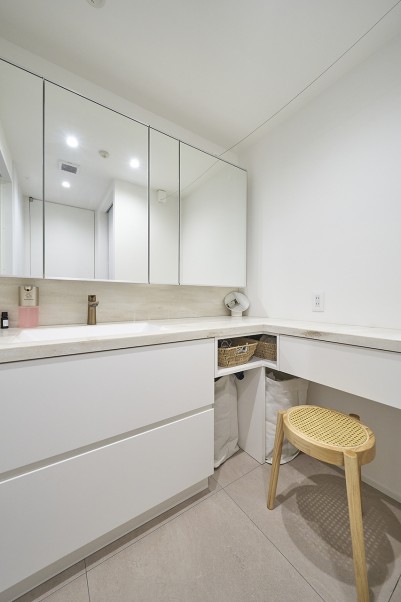 洗面室には、洗濯かごや小物を収納できるスペースを設け、できるだけ生活感を抑える工夫を取り入れました。また、洗濯・乾燥・アイロンがけ・収納までの一連の動作を効率的におこなえるよう、洗濯動線も考慮して設計しました。