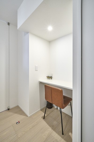 主寝室には収納量を重視したウォークインクローゼットをつくり、通路幅を最小限に抑えることでスペースを有効活用。窓側の壁面にはデスクを備え付け、ご夫妻で在宅勤務できる環境を整えました。