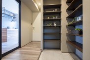 光が届き、広くて明るく清潔感のある部屋になっています。 - 2広い玄関玄関を横長にもうけ、下足収納はあえてオープン棚にすることで広さをだし、透明ガラス入りのリビングドアから光を取り込むことで、明るい開放的な玄関しました。