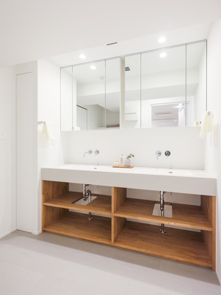 閉鎖的だった洗面室は、スペースを拡張して大きな2ボウル洗面台を造作。家族が並んで同時に使えるため、忙しい朝の時間を効率的に過ごせます。トイレにも壁一面に木材を取り入れ、間接照明と窓から差し込む自然光が明るく快適な空間を作り出しています。