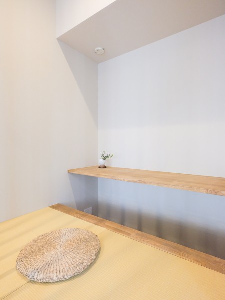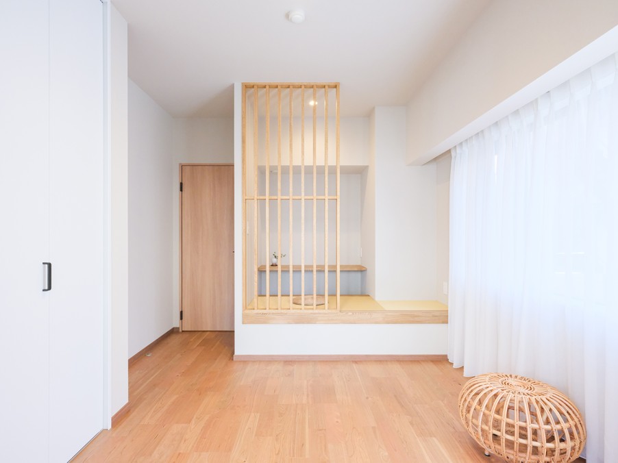 洋室には、もともとクローゼットだった部分に小上がりのスペースを新設。白茶色の畳を敷き、木格子のルーバーパーテーションでさりげなく空間を区切りました。造作カウンターを活用して仕事や読書ができ、一人の時間を大切にできるスペースとなっています。