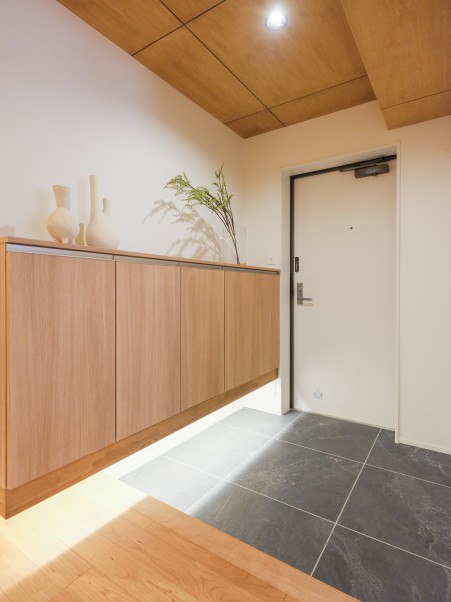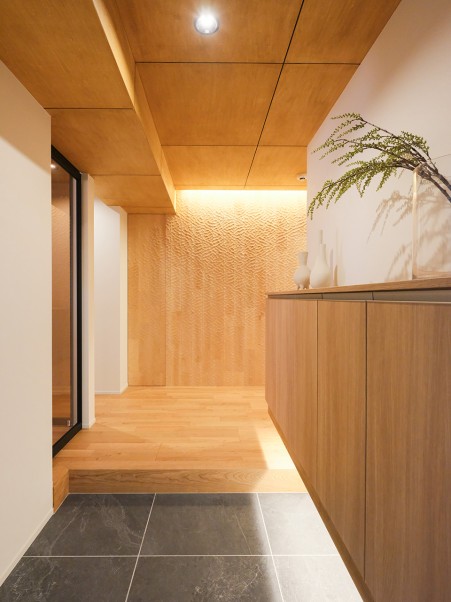 コンパクトだった玄関は、廊下の一部を取り込むことでスペースを拡張しました。床材の繊細な筋模様が美しいグレーの大理石タイルと木材とのコントラストが、洗練された雰囲気を演出。天井のダウンライトやシューズボックス下の間接照明が、足元を柔らかく照らします。玄関を入って正面の壁一面には、大伴のなぐり加工を施した木板を取り入れ、光に照らされると凹凸の陰影が浮かび上がり、木の表情が引き立ちます。