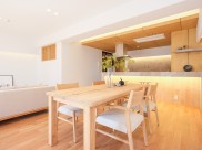 内装のテーマは、「木のぬくもりを感じる家」。床や天井、造作家具に木材をふんだんに使用しました。木材の質感を引き立てる間接照明は、調光機能で灯りによる空間演出も可能です。