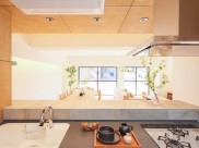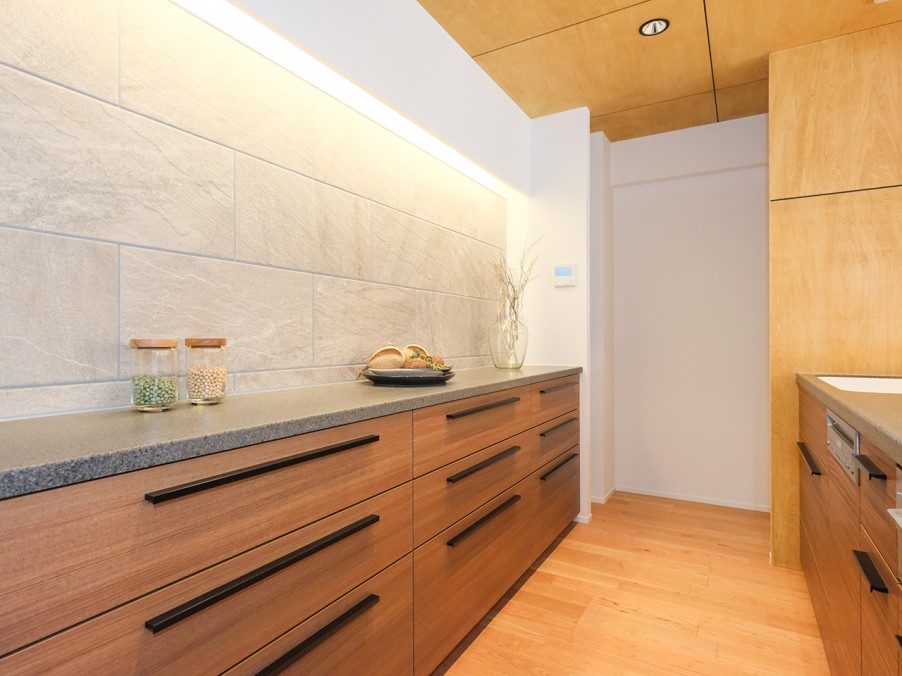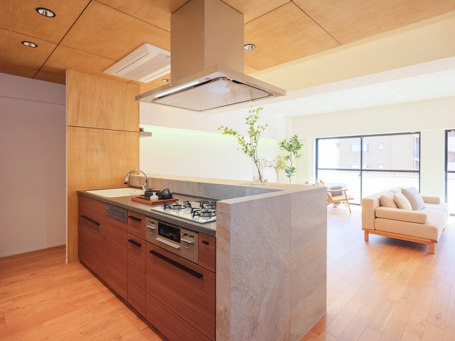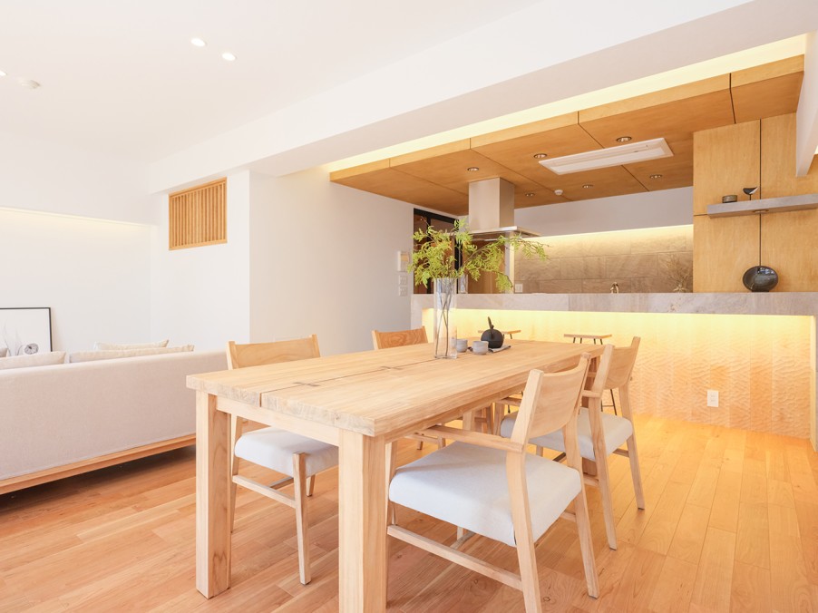 独立していたキッチンは、リビングが見渡せるオープンキッチンに変更しました。天板に使用した表情豊かな凹凸感のある石材タイルは、柔らかな色味と自然な色むらがあり、温かみを感じさせます。腰壁の木材には、なぐり加工を施し、ハイスツールを配置することでバーダイニングとしても活用可能です。夜には間接照明がキッチンを穏やかに照らします。