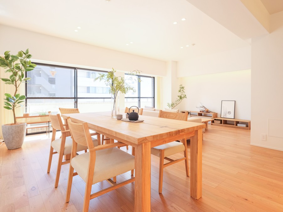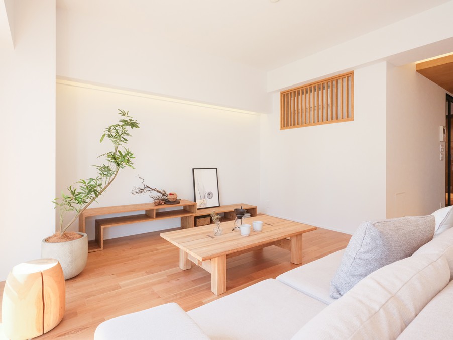 細かく区切られた4LDKを、家事動線の良い3LDKに変更。明るく開放的なリビングを中心に、家族が自然と集まり、ゆったりとくつろげる空間へとリノベーションしました。 - 2木のぬくもりが息づく、居心地の良い空間