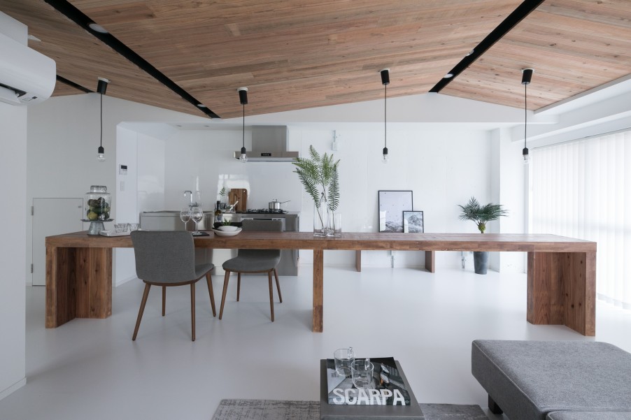 中央にある長い木製のカウンターテーブルと同じ種類の木で、お部屋に統一感が出るようにしました。斜めになった天井は、マンションにありがちな梁を柔らかく隠し、空間に木のやわらかな表情をもたらしてくれています。 - 2LDの造作テーブルは、あらゆるシーンを想定して設計しました。中央に造り付けのテーブルがあります。中央のテーブルはダイニングテーブルとしてだけでなく、料理の作業台やワークスペース、あらゆるシーンで使っていただくことを想定しています。