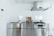 - 3ステンレスのキッチンや洗面台グリル付きの3口コンロと、広いシンクを備えたステンレス製キッチン。料理好きの方でも納得の仕様です。