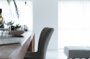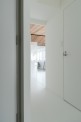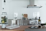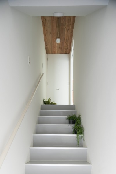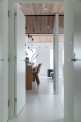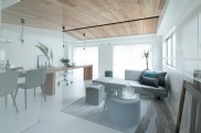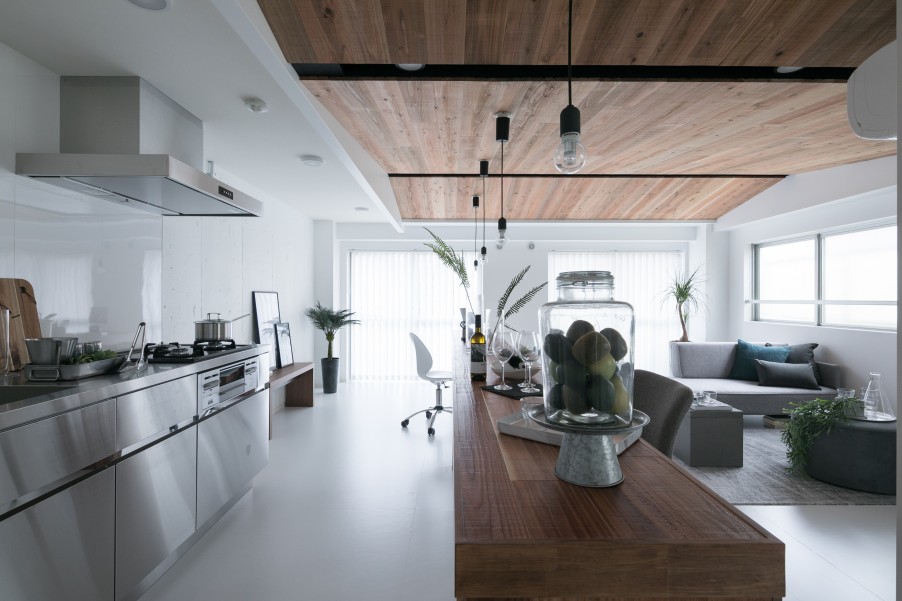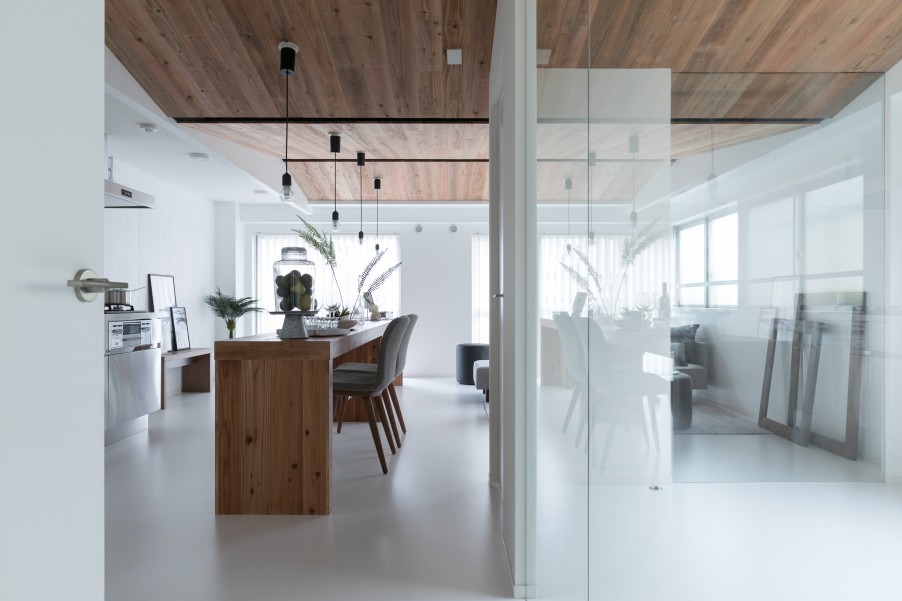 レトロなランプで照らされた玄関扉、開けてすぐの階段、廊下や水まわり、リビングも白を基調とした空間にしました。木とガラスとステンレスの素材のバランスを考え仕上げています。広がりを持たせる為にLDKと居室をガラスにて仕切りました。天井と造り付けテーブルに施された、表情豊かな木の暖かみがお部屋のアクセントになっています。