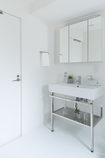 窓のある洗面室には、ステンレス脚の洗面台が存在感を放ちます。