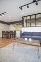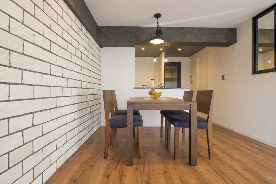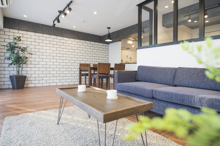 - 2白を基調としたリビングスペースリビングの一部にはレンガ調の白いタイルを貼り雰囲気を出すように設計しました。