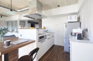 梁とキッチンカウンターと棚板の素材を無垢材でお揃いに。毎日のお料理が楽しくなる場所に。