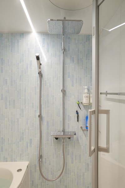 海の好きなM様には爽やかな色合いをと思い、キッチンや洗面室の照明にはナチュラルな色合いの温白色の照明器具をお選び致しました。