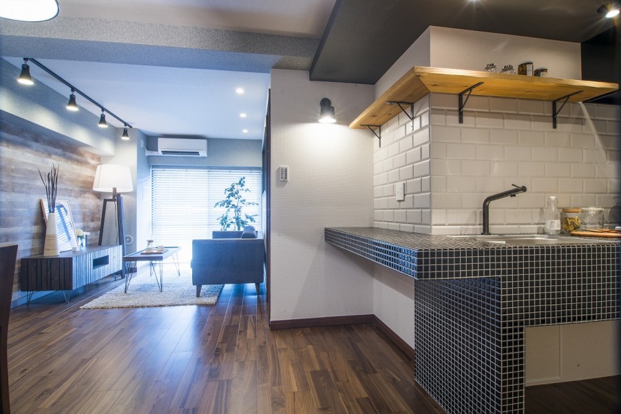 また、床に埋め込んだ間接照明やキッチンのブラケットは、お酒を楽しむような大人な空間作りをイメージしプランニングしています。 - 2湘南台1分という好立地駅近には飲食店も多く、お出かけも楽しい場所での暮らしです。買い物の便が良いため、仕事で忙しい平日も食事は“中食"が中心になると考え、キッチンはインテリアの一部となるようにかっこよさを追求しました。