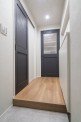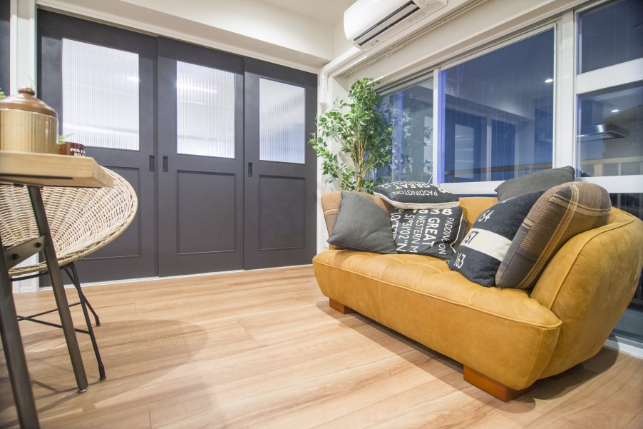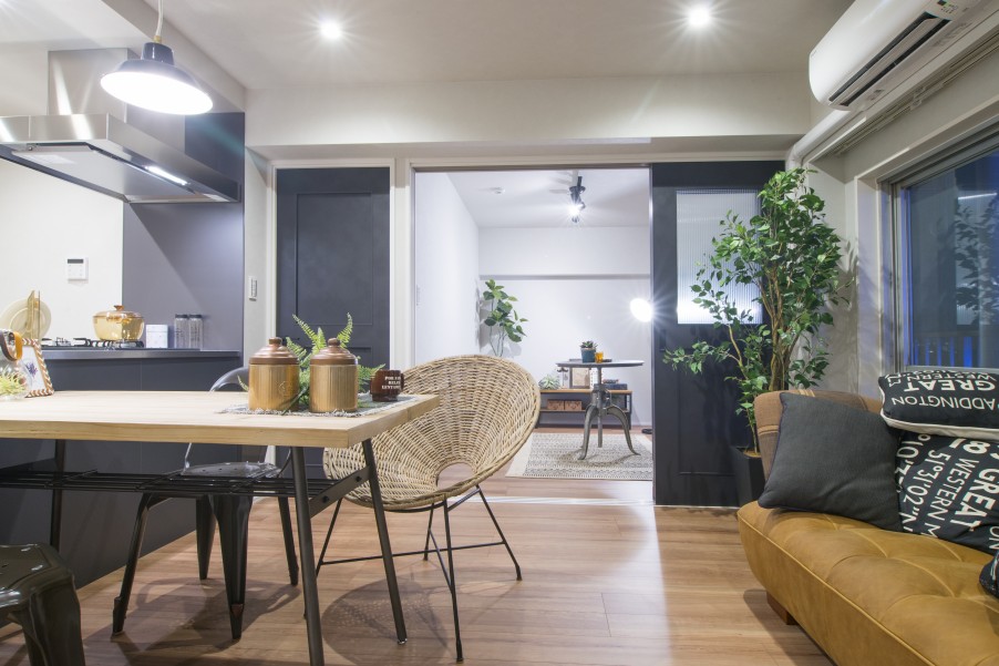 - 1昼でも夜でも、心地いい光の漏れる空間ビンテージテイストのブラックドアとメープル柄フローリングをベースに。昼でも夜でも居心地のよい空間を考えました。
