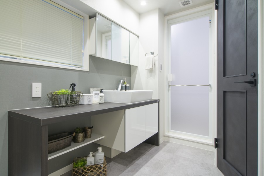 また、洗面化粧台のカウンターを洗濯機横まで伸ばし、小物を並べてプライベートな空間でも楽しめるようにしました。