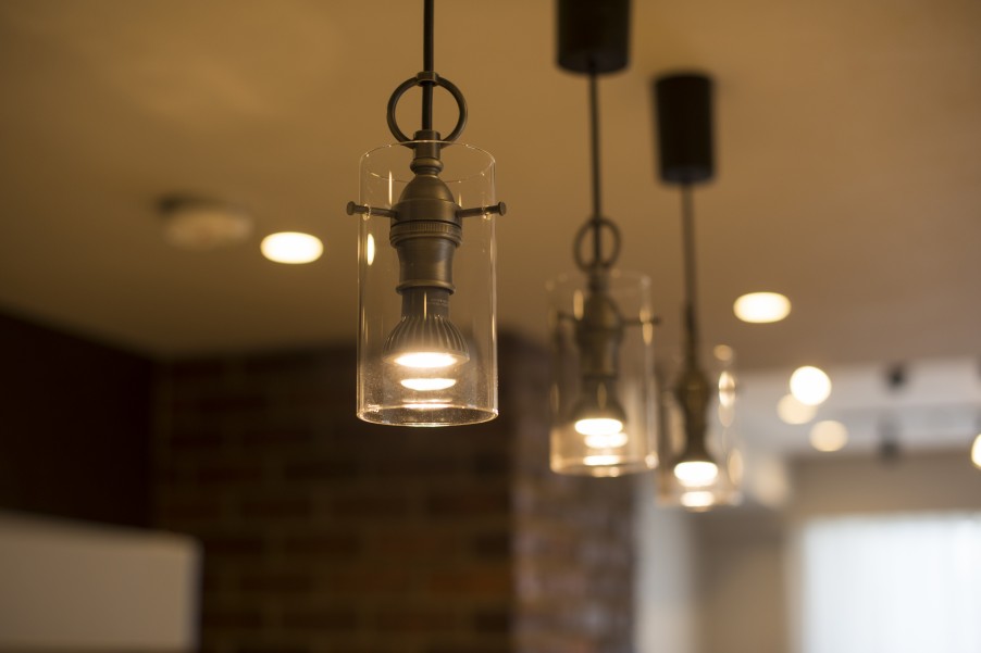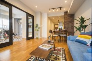 - 1レンガ素材のアクセントをダイニングとキッチンにレンガ素材の凹凸がお部屋に個性を出します。