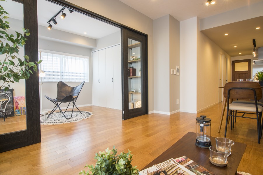 リビング横の洋室は広がりを出す為に引き戸の透明ガラスとして多目的に使用出来ます。