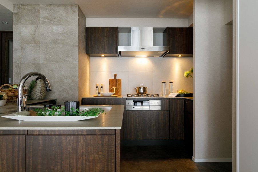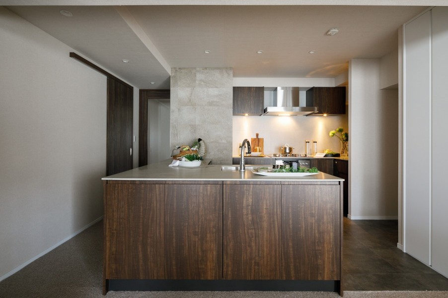 - 3扉・カウンターにも拘った人工大理石のオリジナルキッチンキッチンを中心に集う生活。一際大きなキッチンは、家族や友人が集う場として、一人で料理に没頭する場として。いつでも中心になるようにと、間口に合わせて特注し、扉・カウンターにも拘ったオリジナル。