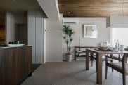 - 1リビングの天井に無垢板を施した温もりのある空間リビングダイニングの天井にはウェスタンレッドシター天然オイル仕上げを施し、玄関とキッチンの壁を石調タイル貼にするなど、木の温もりと石調タイルとカーペットの調和が心地よい素材感の伝わる内装。